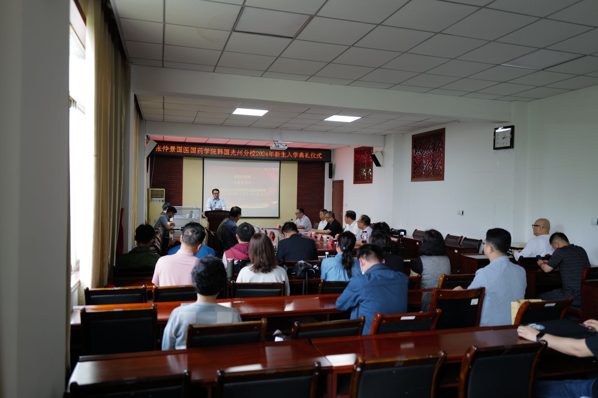 本网讯(特约记者/刘征)6月6日上午8点,南阳理工学院张仲景国医国药学院韩国光州分校留学生新生入学典礼,在11号教学楼会议室举办。我校副校长葛晨光教授、韩国光州分校校长崔洪採博士、招生就业处处长祝孔涛、国际交流合作中心主任高东晓、教务处副处长刘尚争教授、张仲景国医国药学院书记段焰、副院长胡久略教授出席了本次典礼。
