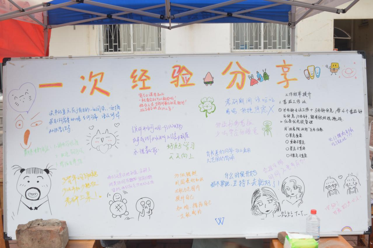 通过简笔画与文字分享考研备考、时间管理等经验,色彩斑斓的留言吸引学弟学妹拍照记录,搭建起跨年级的智慧交流平台。