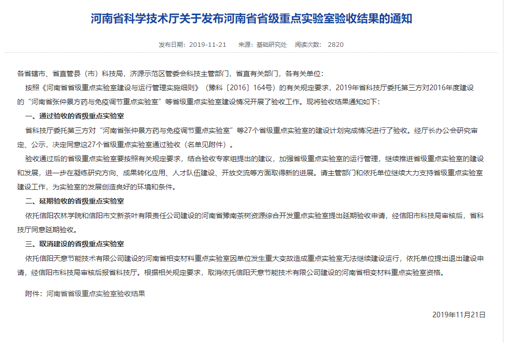 11月21日,河南省科学技术厅发布关于河南省省级重点实验室验收结果的通知,按照《河南省省级重点实验室建设与运行管理实施细则》(豫科〔2016〕164号)的有关规定要求,2019年省科技厅委托第三方对2016年度建设的“河南省张仲景方药与免疫调节重点实验室”等省级重点实验室建设情况开展了验收工作。