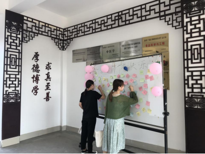 国药学院学生会代表也别出心裁,在11号教学楼大厅搭起了星语心愿墙,同学们纷纷在便利贴上写上了对老师衷心的祝福。同学们三五成群到每个教研室对老师们献上了最真挚的感谢,气氛热烈感人!
