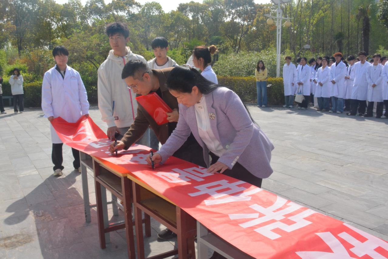 最后由学生代表张书豪同学领读医学生誓词,共同行三鞠躬礼,领到以及各班代表在横幅上签字。