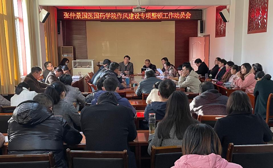 本网讯(特约记者/刘征 通讯员/刘长霞)11月10日,张仲景国医国药学院于11教会议室召开作风建设专项工作整顿动员会,学习传达了南阳理工学院作风建设专项整治动员会会议精神,部署了我院专项行动实施方案要求。会议由学院院长卞华主持。学院领导班子、中层干部、支部书记和全体老师参加会议。