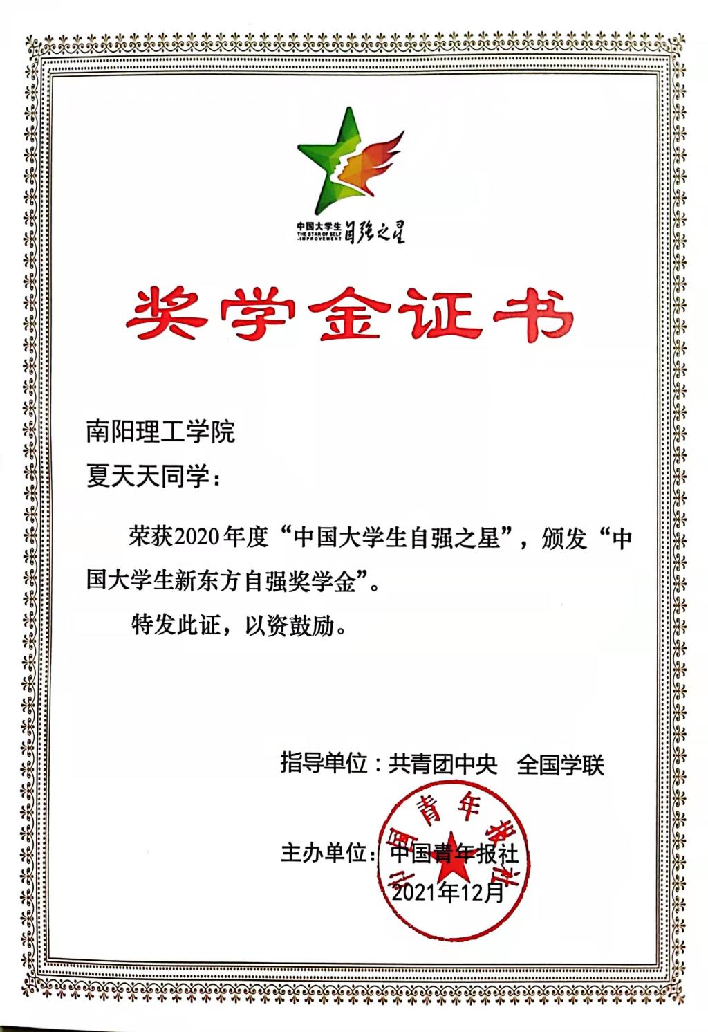 (本网讯 特约记者/王同斌)近日,我校张仲景国医国药学院夏天天同学荣获“中国大学生自强之星”奖学金。本奖项是由共青团中央、全国学联共同组织举办,评选结果于2021年12月份揭晓,2022年3月份颁发证书。