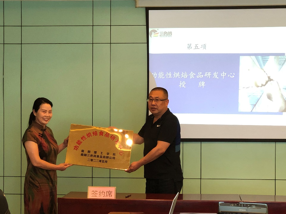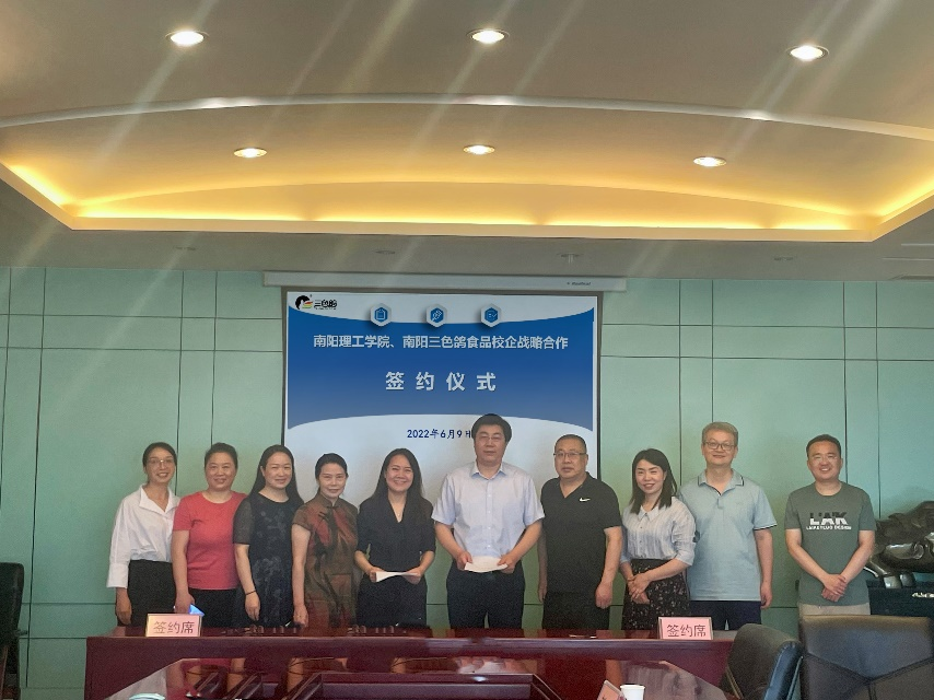 本网讯(特约记者/马艳莉 赵磊 )2022年6月9日,张仲景国医国药学院院长卞华、党委书记段焰和教研室主任马艳莉带领食品学专业教师刘尚军、赵磊等一行人,赴南阳三色鸽食品有限公司洽谈签约了校企合作暨实习就业基地协议以共建研发中心。三色鸽食品有限公司董事长陈景燕、常务副总丁岩峰、财务总监周建侠和总经(考核)办主任党春焕等参与了本次签约挂牌仪式。