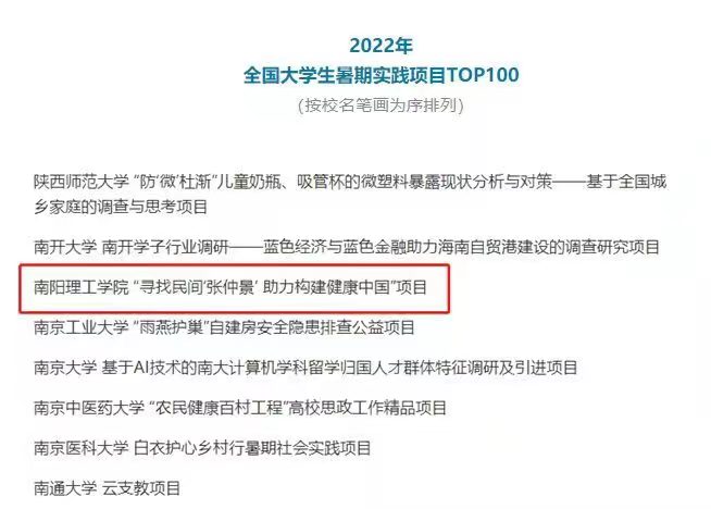 本网讯(特约记者/王同斌)近日,由中国青年报社开展的2022年第八届全国大学生暑期实践展示活动名单公布。经过高校推荐、团队自荐、网络展示等环节,我校张仲景国医国药学院“寻找民间‘张仲景’助力构建健康中国” 项目,获评2022年第八届全国大学生暑期实践项目TOP100。