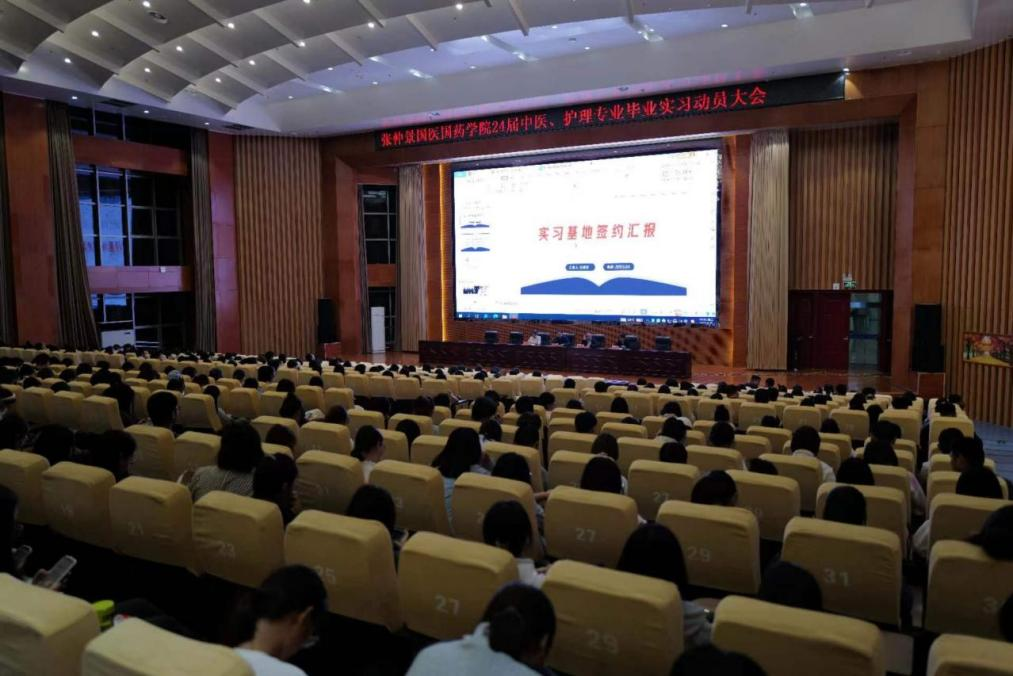 本网讯(特约记者/刘征 通讯员/单胡仪 )为了使毕业生们进一步了解实习内容,提高实习期间的综合分析能力和解决问题的能力,我院在第三学术报告厅召开了张仲景国医国药学院毕业实习动员大会。出席动员会的领导有学院党委副书记岳伟国、副院长胡久略、大学生综合创新实训中心主任石景洋、中医教研室主任段培培。毕业生辅导员及全体毕业生参加了大会。