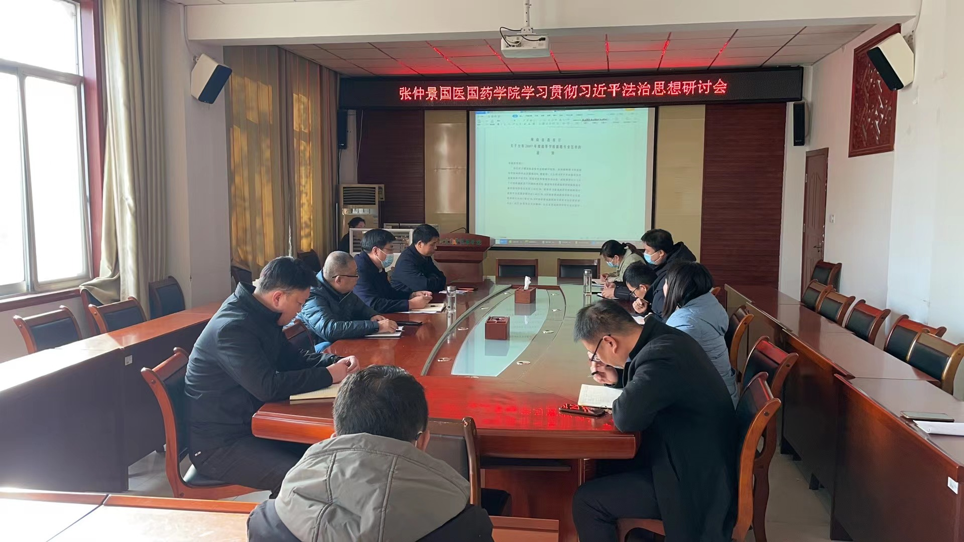 2023年11月13日下午,张仲景国医国药学院召开党委理论学习中心组学习会议,进行习近平法治思想专题学习,学院党委理论学习中心组全体成员和科级干部在学院211会议室参加会议,会议由学院党委书记段焰主持。
