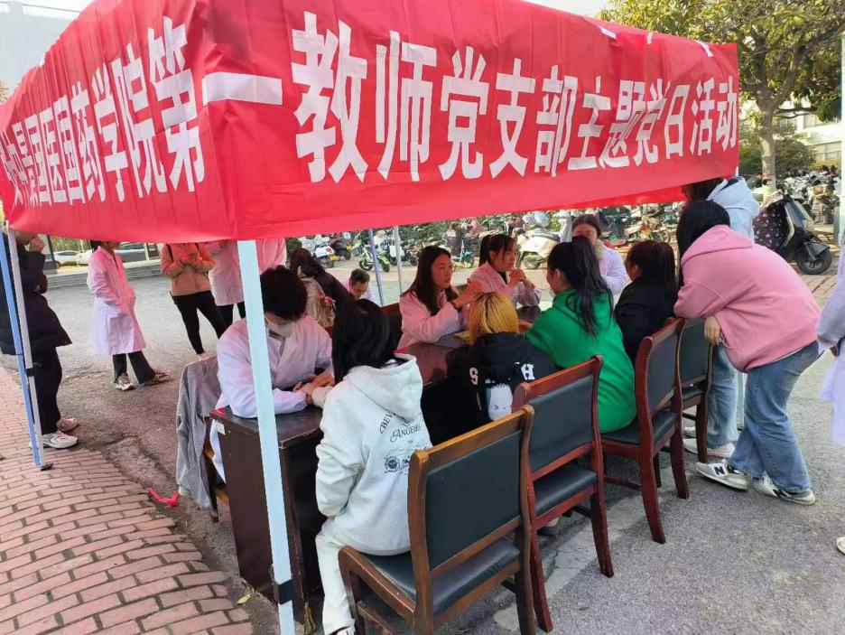 义诊现场,支部老师认真为学校师生“望闻问切”,提供一对一接诊服务,并对一些常见疾病的预防、治疗进行讲解和指导。对现场可以处理的疾病,及时为师生针灸治疗;学生支部同学积极配合老师开展测血压、脉诊等志愿服务。