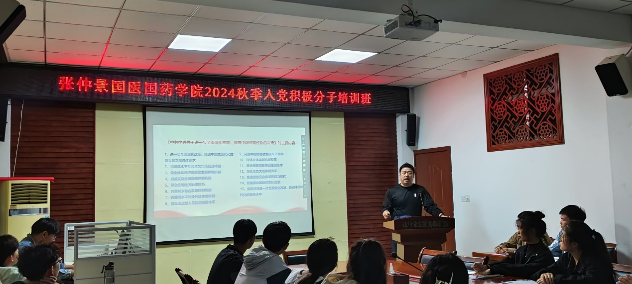 本网讯(学生记者/杨嘉鹏)10月17日晚七点,我院第三十三期入党积极分子培训班专题党课《深入学习贯彻党的二十届三中全会精神》在学院11#211会议室举行。本次培训课由学院党委副书记岳伟国讲解。本次培训班共有60名入党积极分子参与。