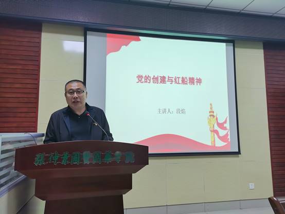 段焰从“党创立的历史背景”、“党的一大胜利召开”、“红船精神的提出及其内涵”以及“红船精神的继承和发扬”四个方面讲授党的创建与红船精神。他从为什么会创立中国共产党,为什么能创立中国共产党,结合丰富历史事件和人物事迹,分析了党的创立的历史背景;从召开之前的思想、阶级、组织、理论等方面的准备,召开的时间、地点,与会代表情况、大会的成果、会后的发展、最初斗争的经验教训等六个方面介绍了党的一大会议召开的情况;从开天辟地、敢为人先的首创精神,坚定理想,百折不挠的奋斗精神,立党为公,忠诚为民的奉献精神讲解了红船精神的内涵;他强调党的一大的胜利召开,标志着中国共产党正式成立,中国革命有了新舵手,中华民族有了新的希望,只有共产党才是真正为人民大众的党。