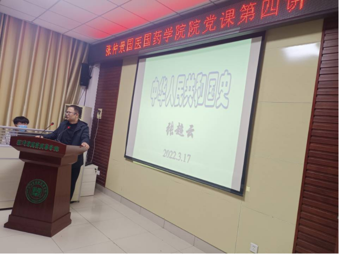 本网讯(学生记者/陈梦 王壮)为了使学生们厚植爱国主义情怀,把新中国的党史和建国史实现有力统一,引导学生增强中国特色社会主义道路自信、理论自信、制度自信、文化自信。3月27日,张仲景国医国药学院学院分党校入党积极分子培训班第四讲在学院211会议室举行。本次党课由张仲景国医国药学院副院长张超云主讲。