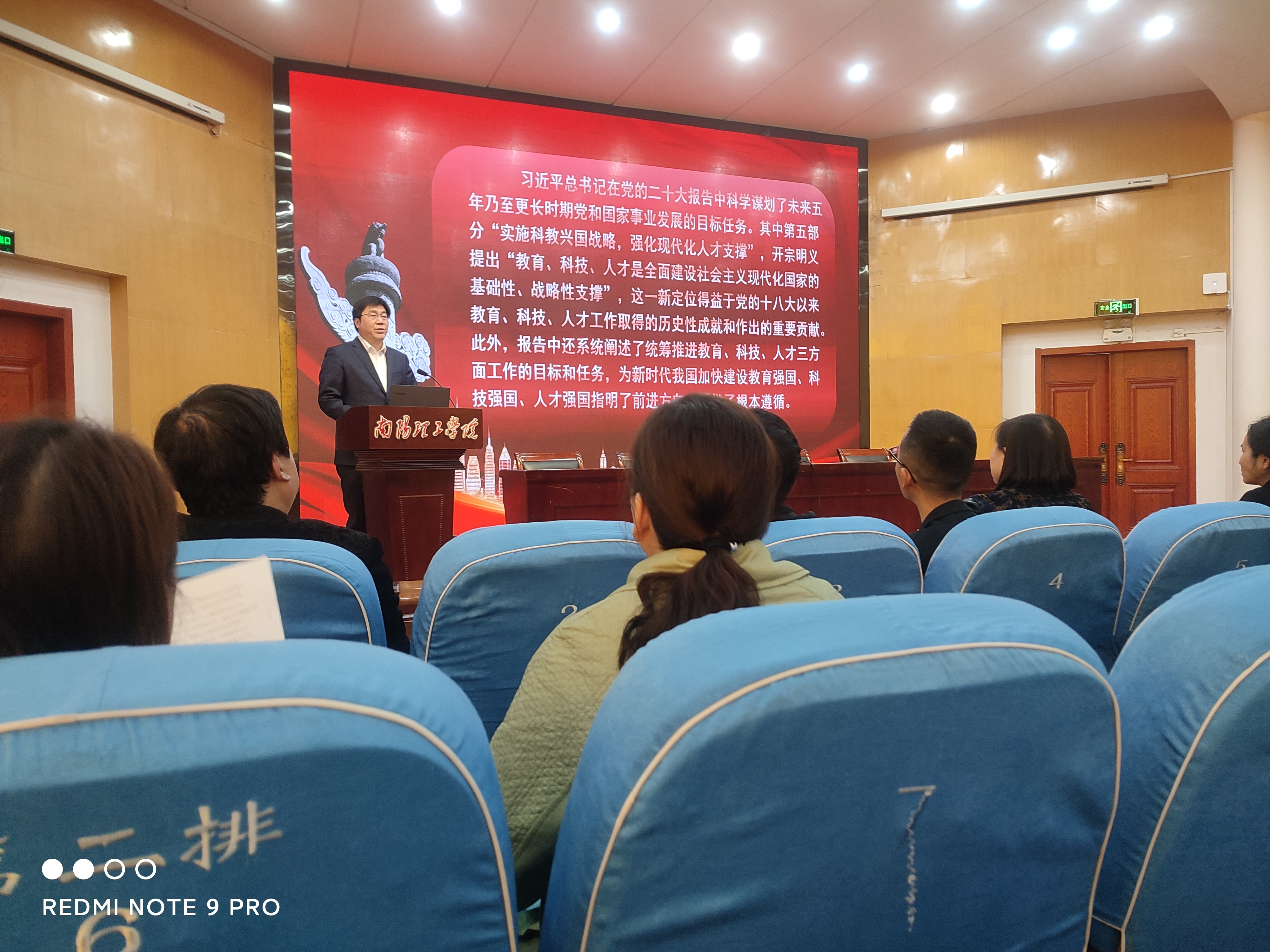 卞华围绕“新时代我国教育、科技、人才工作取得的成就”、“深刻把握党的二十大报告中教育、科技和人才工作部署的亮点”、“新阶段我国教育、科技、人才工作的新任务”三个方面展开论述,将党的二十大报告与国家、省市以及学校改革发展紧密结合,准确深入地阐释了报告的内涵和外延,为学院扎实开展好主题教育,推动教育教学工作提供了理论指引。