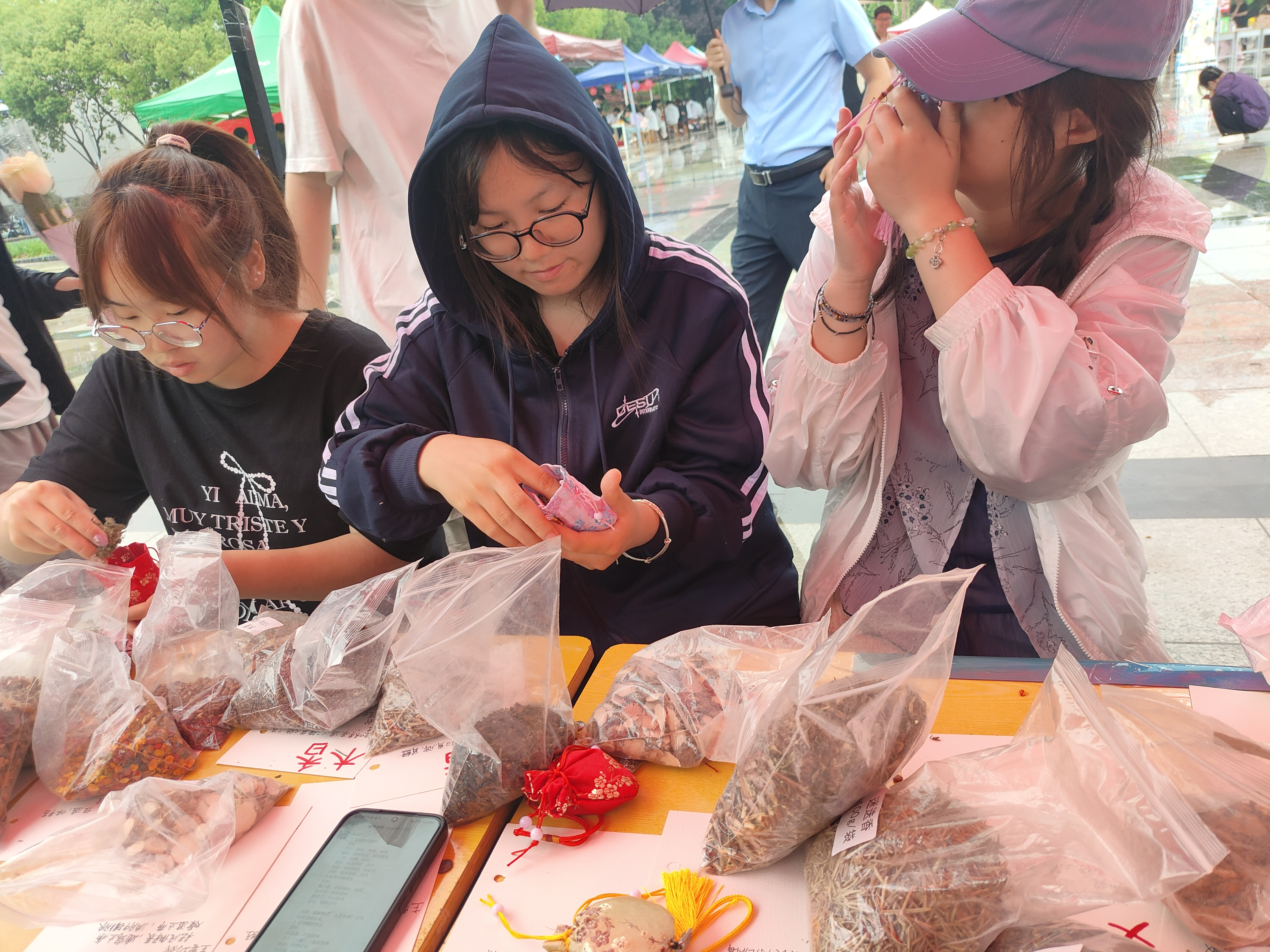 活动伊始,通过生动形象的实物展示与案例讲解,带领同学们认识薰衣草、合欢花、远志等20余种具有安神解郁功效的中药材。“原来中药材不仅能治病,还能调节情绪!”随后的限时记忆挑战环节,同学们全神贯注,在5分钟内争分夺秒记忆药材信息并完成答题,沉浸式的学习体验帮助大家暂时忘却学业压力。成功通关的同学获得香囊制作材料包,缝制香囊,大家将压力转化为创造力,专注于手工制作的每一个细节。