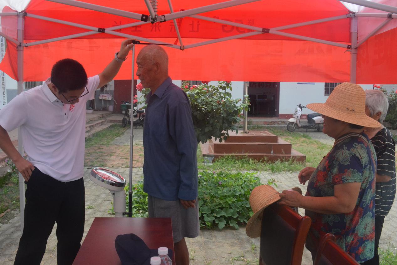 志愿者为村民测量身高体重。秦盼盼供图。