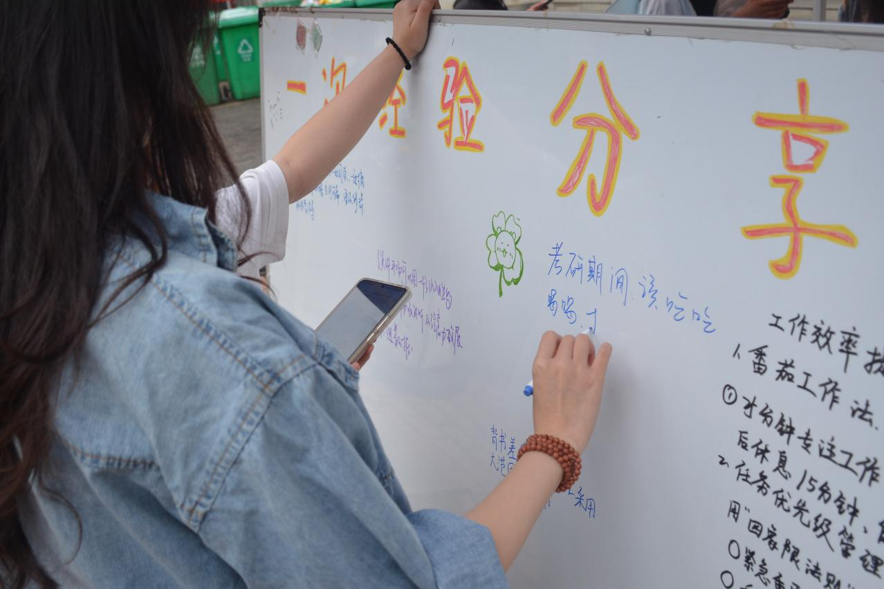 在展板前,毕业生们用马克笔具各展创意。有的同学分享了提升学习效率的方法,有的同学提供了高效背专业课的方法画上了可爱的简笔画,色彩斑斓的展板引得学弟学妹纷纷拍照记录。