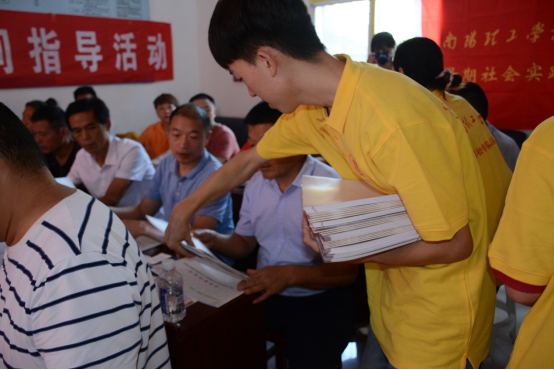 图为实践队员为现场人员发放学院制作的药物栽培手册 摄影员 查清云 摄