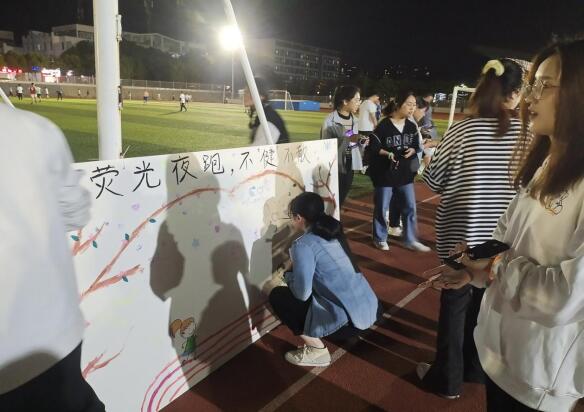 本次活动共吸引将近80名毕业生参与活动,各位参与者首先领取一个荧光棒手环,然后按照自己定下的计划进行夜跑,跑步结束后可在荧光手印签到墙进行打卡签到。通过本次活动,有利于呼吁广大毕业生放下手中的手机,走出宿舍,拒绝平躺,在荧光乐跑中提高同学们的身体素质,加强同学们之间的凝聚力,在欢乐跑中释放心中的压力,勇敢面对光明的未来。