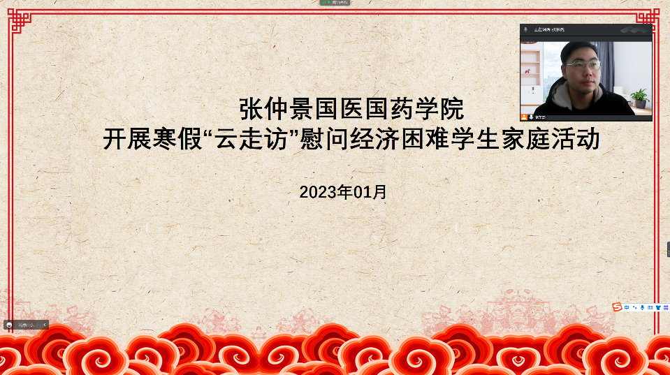 为关心家庭经济困难学生成长发展,进一步宣传相关资助政策,2023年1月14日,张仲景国医国药学院通过线上方式开展“云家访”活动。本次家访通过微信平台,腾讯会议等方式,采取线上视频连线方式,了解学生健康状况和生活状态,走访建档立卡、低保等经济困难家庭学生。