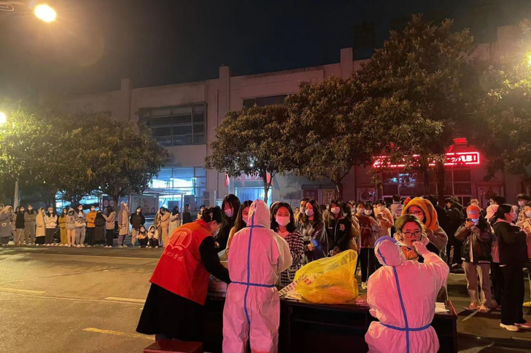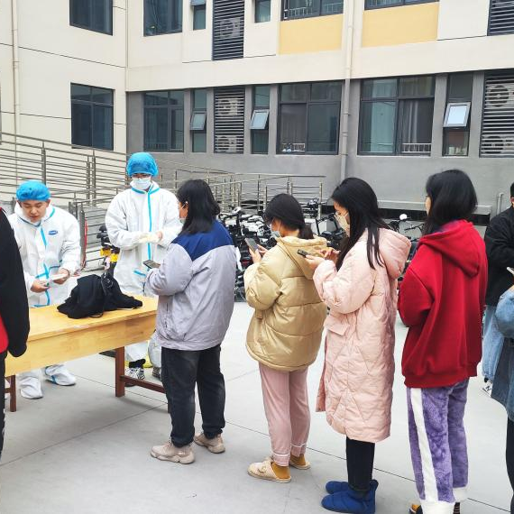 “天还蒙蒙亮的时候我和许多出发去检测台的志愿者相遇在路上,我和大家一样,对即将开始的核酸检测工作紧张而期待,紧张着未知工作程序自己能否顺利完成,期待着自己能够对有意义的志愿工作贡献多少的力量。到场后明确不同志愿者的分工、为每一个检测台定员、保障每一个检测台志愿者穿好防护服、带动协助志愿者保障物资供应与检测台做好配合,终于第一轮核酸检测圆满完成。之后高频率的核酸检测在风雪中、在寒冬里、在志愿者们的高度配合下圆满的完成。一次次核酸检测工作中,我们一次次的熬夜又早起,和老师在深夜的校园中考察场地商议路线,凌晨三点、四点、五点甚至六点分批休息,只为了让次日的核酸检测流程更加的完善妥当,节约每一位同学的时间,减少聚集的风险。有幸站在这个队伍之中我深感荣耀,我相信,只要大家并肩同行,就会战胜疫情。”接受采访时他们这样说,接受采访完仍坚持也不愿透漏姓名,他们说“抗击疫情是每一个人应有的坚守和奉献。”。
