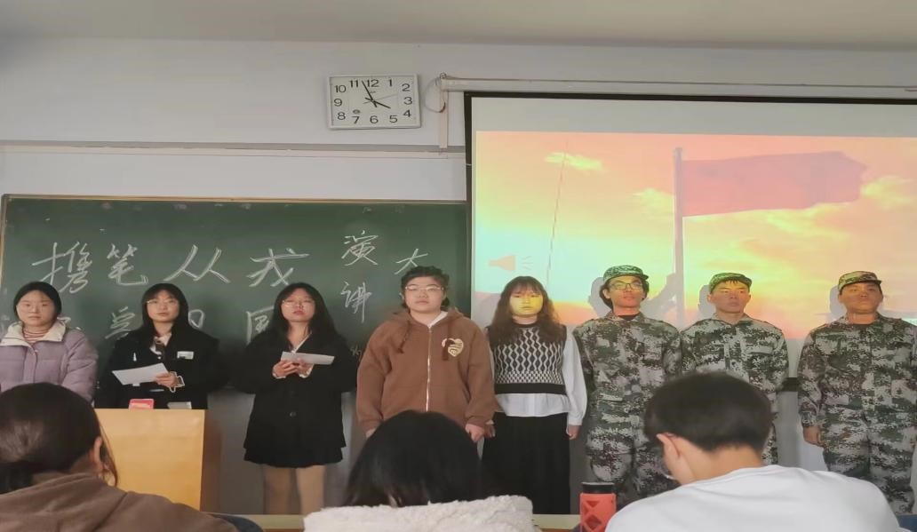 本网讯(学生记者/范佳佳)为弘扬我党我军优良传统,宣扬革命英烈事迹,强化大学生国防观念,增强国防意识,激发同学们携笔从戎保家卫国的积极性,我院于3月26日在11教507教室举办第三届“20岁的他们和我们——携笔从戎·保家卫国”讲演大赛。