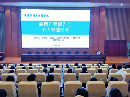 为使2019级新生们尽快适应大学生活,我院于2019年11月6日晚在图书馆第三学术报告厅开展感恩自强报告会。此次活动由我院党委副书记岳伟国致辞,优秀学生代表李青霞、刘镇亚、夏天天参与发言,2019级新生参加。