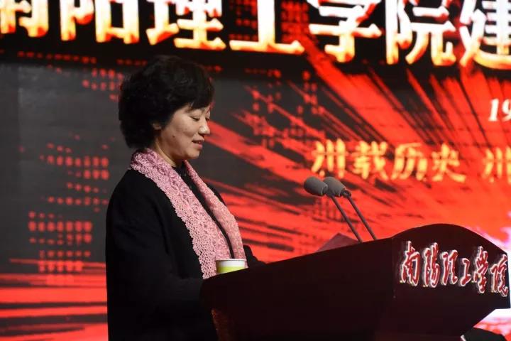 刘荣英代表南阳理工学院及全体师生员工,向出席庆祝大会的各位领导、社会各界朋友、校友代表,表示最热烈的欢迎、最衷心的感谢和最美好的祝福!她说,建校30年来,历任领导坚守初衷、宵旰图治,拓荒创业,披肝沥胆;全校师生众志成城,同德同心,弘扬“不甘示弱”的南工精神,秉承“厚德、博学、求真、至善”的南工校训,坚持“立本、立真、立特、立新”的办学理念,植根南阳、服务河南、面向全国,持之以恒走产教融合、校企合作的开放办学之路,坚定了应用型高校的定位自信、方向自信、路径自信和前景自信,形成了弥足珍贵的“不甘示弱、抢抓机遇、百折不挠、自强不息”的文化传统,支撑着南工人持续内涵建设的强大动力,涌动着南工人永不衰减的办学激情,激励着南工人铿锵有力的前行步伐。三十年与时俱进,铸就了永载史册的光辉历程。三十年学脉绵延,培养了素质优良的栋梁之才。三十年木铎金声,打造了德业双馨的教师队伍。三十年孜孜以求,拓展了服务社会的广度深度。三十年砥砺前行,奠定了开放办学的坚实根基。