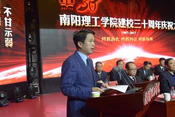 他指出,南阳理工学院三十年的辉煌业绩,充分体现了中国特色社会主义制度的优越性和文化自信力。南阳理工学院白手起家、从无到有、从小到大的发展历程和成功实践,凝结着各级历届党委、政府的关怀和支持,以及在京南阳籍老领导们的桑梓之情,铭刻了南阳理工人大无畏的艰苦创业创新精神,生动地宣示了有条件要办,没有条件创造条件也要办的雄心壮志。他希望, 进入新的历史阶段,实现新的奋斗目标,南阳理工要认真学习贯彻即将召开的党的十九大会议精神,认真领会习近平总书记的重要思想,同以习近平同志为核心的党中央保持高度一致,努力做好各项工作。要坚持有中国特色的社会主义办学方向,把立德树人作为中心环节,把思想政治工作贯穿教育教学全过程,实现全程育人,全方位育人。学校要不断提升人才培养质量,全面提高办学水平,建设特色学科专业,优化教师队伍结构,增强社会服务能力。要大力发扬艰苦奋斗和开拓创新精神,干在实处,走在前列,勇立潮头,谱写新的华章。