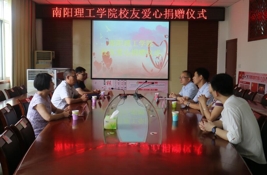 本网讯 (特约记者/王同斌 学生记者/黄万里),一方有难,八方支援,6月25日,我院在十一号教学楼会议室举办校友爱心捐赠仪式。河南波恩贝尔啤酒技术开发有限公司副总经理白长新、技术工程师崔满满、南阳理工学院校友会联谊科科长陈建文、我院副院长胡久略和黄显章出席此次会议。会议由胡久略主持。