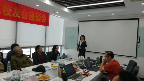 薛老及众校友听取刘腾讲述自己事业的长远规划与前瞻趋势介绍。