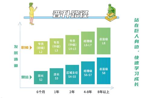门店新员工训练期→代理班长 →班长→代理店长 →店长→代理片区主任→片区主任→代理营运经理→营运经理→更高职位