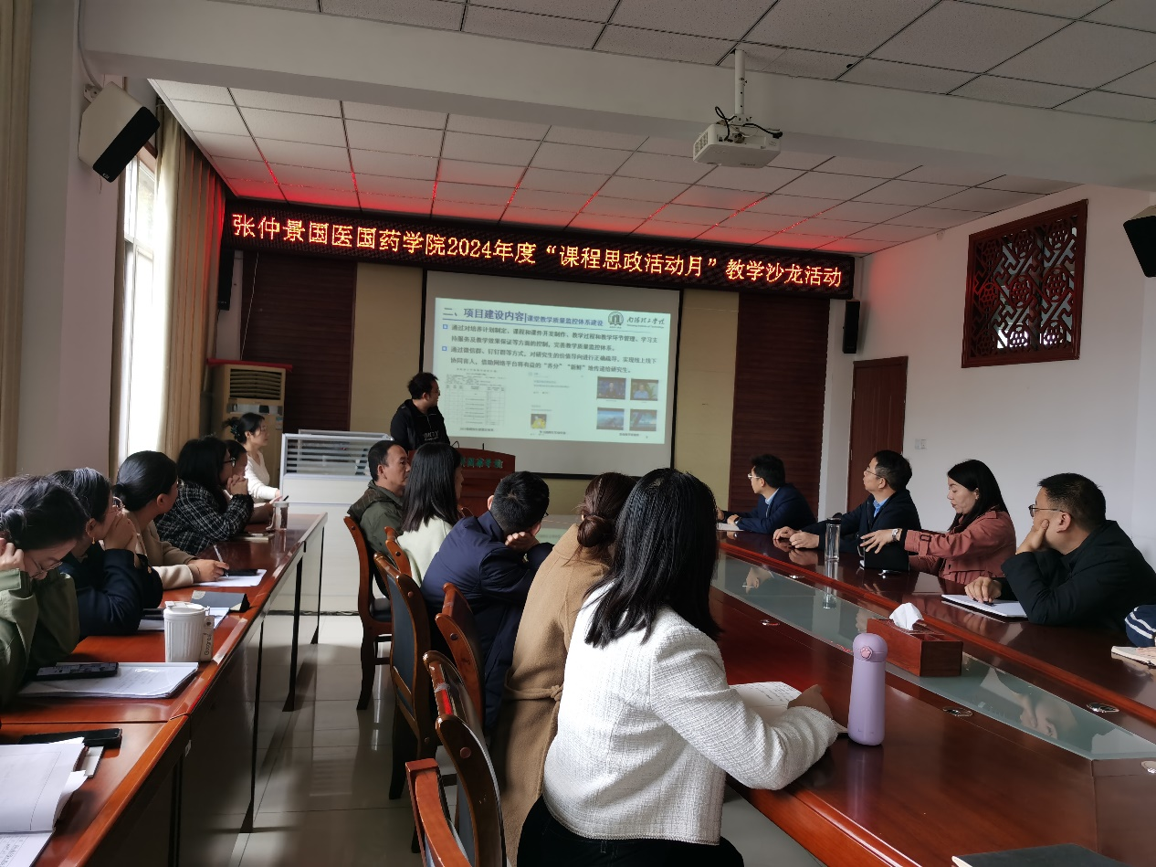 本网讯(学生记者\蔡婧昱)为了提升教学质量,提高育人成效,深化思政教育,将思政教育与专业课程深度融合,充分发挥学院在课程思政建设中的主体作用,张仲景国医国药学院于11月12日下午开展2024年度“课程思政活动月”教学沙龙活动。此次沙龙活动由史艳平老师主持,各教研室老师积极参与,共同探讨如何将思想政治教育融入专业课程。